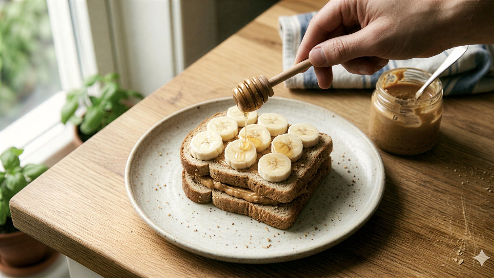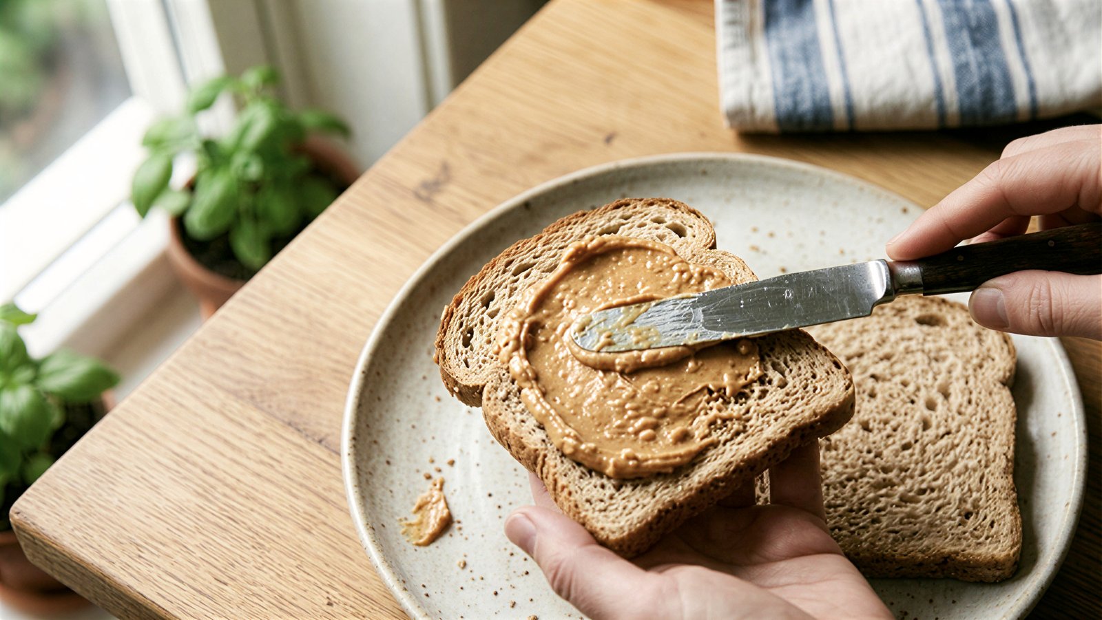 1.Warm the peanut butter slightly – Place the jar in a cup of warm water for 1–2 minutes to soften it. Makes spreading easier without tearing the bread.